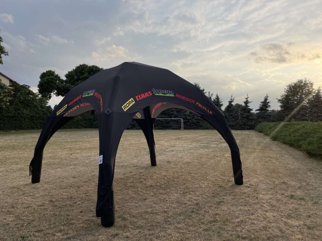 Każdy namiot dmuchany jest wyprodukowany zgodnie z najwyższymi standardami. Warstwa górna namiotu nadmuchiwanego, czyli dach i ściany, wykonana jest ze specjalnego materiału odpornego na ścieranie o gęstości 240 g/m2, a wymagany nadruk nanoszony jest za pomocą druku sublimacyjnego.
